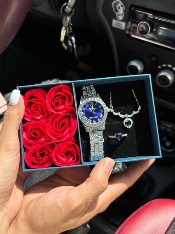 باکس شامل:ساعت٫گردنبند٫انگشتر٫باکس گل معطر